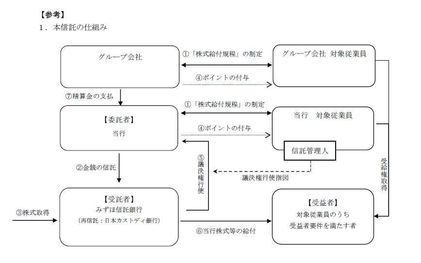本制度の導入にあたり、以下のような信託の仕組みも設けられています。まず、当行とそのグループ会社は「株式給付規程」を定め、対象となる従業員に対して将来給付される株式を予め取得します。この株式取得は、みずほ信託銀行を通じて行われ、依頼された金銭が原資になります。