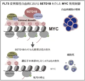 さらに、ヒストン脱メチル化酵素KDM5Cを破壊した場合は白血病細胞が悪性化することも示され、SETD1BとKDM5Cが白血病の悪化に絡むメカニズムが解明されました。