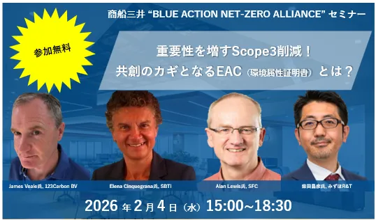 2026年2月4日(水)、商船三井が主催する「商船三井“BLUE ACTION NET-ZERO ALLIANCE” セミナー」が東京都港区の虎ノ門エンパワーメントセンターで開催されます。このセミナーでは、企業や関係者の皆様に向けて、脱炭素に向けた具体的な取り組みや、EAC(環境属性証明書)についての情報を提供します。