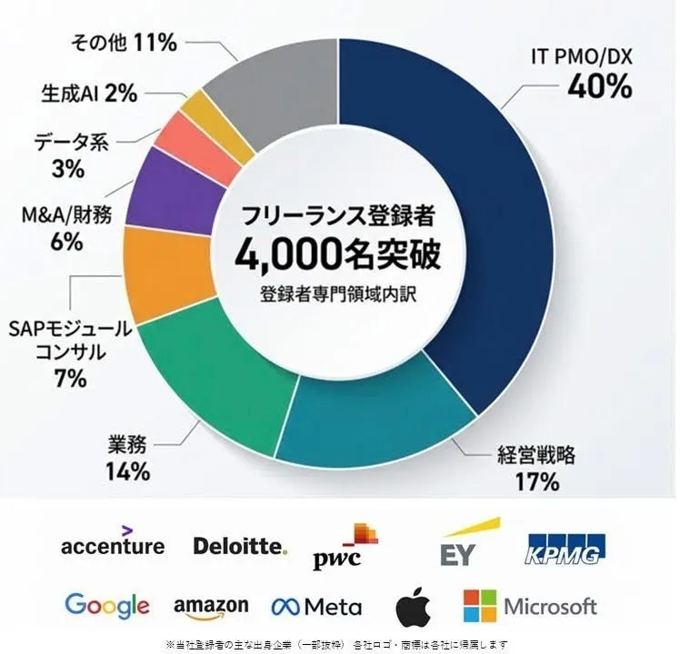 「デジタル人材バンク」の登録者は、アクセンチュアやBig4、GAFAMなどの大手企業出身のハイスキルな人材が多く、IT PMOやDX領域が主要な専門領域として40%を占めています。経営戦略や業務改革もそれぞれ17%と14%を占め、企業のDX推進に直結するスキルが豊富に揃っています。