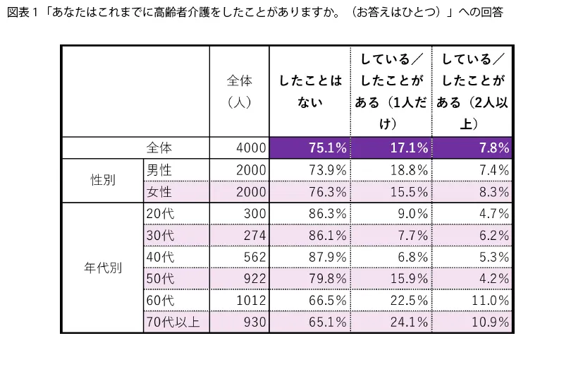 調査により、75.1%の回答者が「高齢者介護をしたことがない」と回答しました。この数字は年代によるばらつきが見られ、特に60代以上で「行ったことがある」人の割合が増加しています。それでも70代以上でも未経験者が65.1%いることから、年齢に関わらず未経験者が多いことが浮かび上がります。男女間の差はあまり見られず、年齢層全般において未経験の割合が高いという結果です。