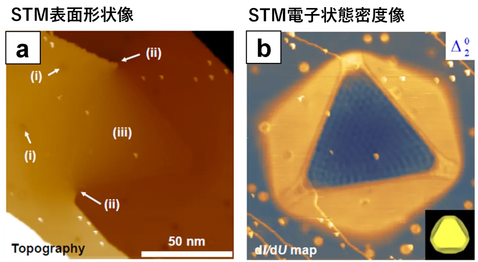超伝導は、特定の金属を極低温に冷却することで電気抵抗がゼロになる現象です。過去の研究では、超伝導体の複雑なバンド構造が原因で、個々の電子の振る舞いを詳細に観察することが難しいとされていました。しかし、今回の研究では、鉛を43 mK(約マイナス273.11℃)まで冷却し、走査トンネル顕微鏡(STM)を使ってその電子状態を詳細にマッピングしました。その結果、鉛の二つの超電導バンドとともに「積層欠陥四面体(SFT)」という特異な構造が観察されました。