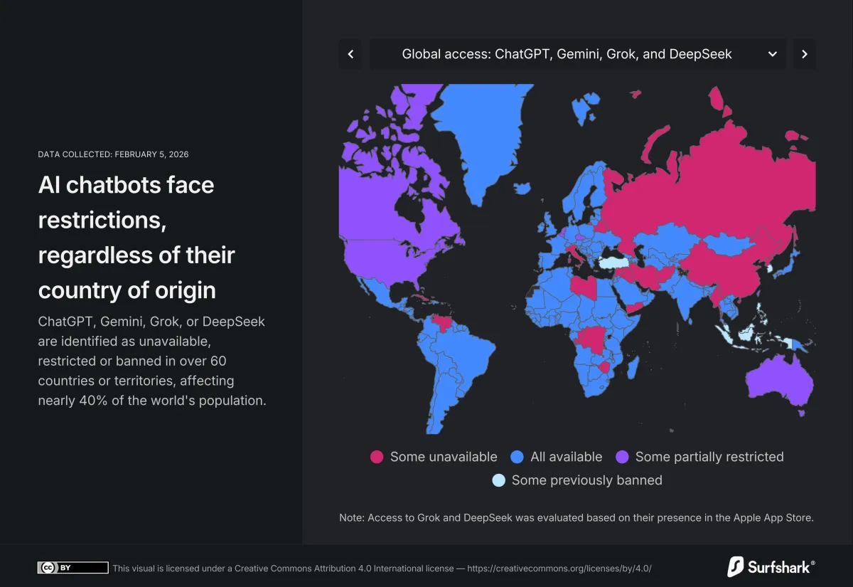 AIチャットボットの規制は特定の技術や製品だけに留まらず、国際的な市場にも影響を及ぼす可能性があります。ChatGPTやGemini、Grokといった他の人気チャットボットも現時点で60以上の地域で使用制限を受けています。これにより、世界の約40%の人口がこの影響を受ける状況となっています。例えば、ChatGPTはイタリアでのデータ保護当局の指導により一時的にブロックされ、その後の商業展開にも影響を与えています。