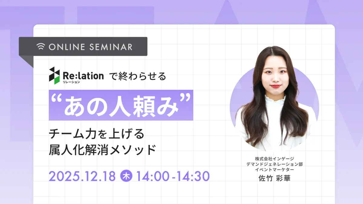 この度、株式会社インゲージが2025年12月18日(木)にオンラインウェビナーを開催することを発表しました。テーマは『Re:lationで終わらせる「あの人頼み」 ~チーム力をあげる属人化解消メソッド~』です。このウェビナーでは、社内のナレッジをAIで効率的に活用し、属人化の問題を解決する具体的な手法を学ぶことができます。