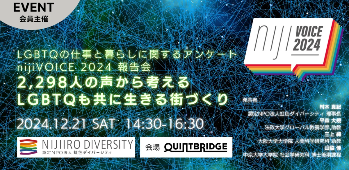 認定NPO法人虹色ダイバーシティが提供する「LGBTQの仕事と暮らしに関するアンケート調査 nijiVOICE2024」の報告会が、2024年12月21日(土)14:30から大阪市で開催されます。この会は、性的マイノリティの現状を知り、共に生きるまちづくりを模索する場として、2,298人から集めた貴重なデータに基づいています。