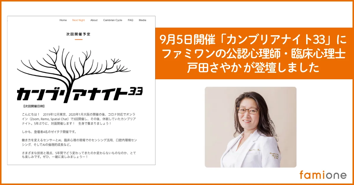 2025年9月5日、東京都神田で開催された「カンブリアナイト33」に、株式会社ファミワンの公認心理師・臨床心理士である戸田さやかが登壇しました。このイベントは、コロナ禍を経て5年ぶりの対面開催ということもあり、多くの関心を集めました。