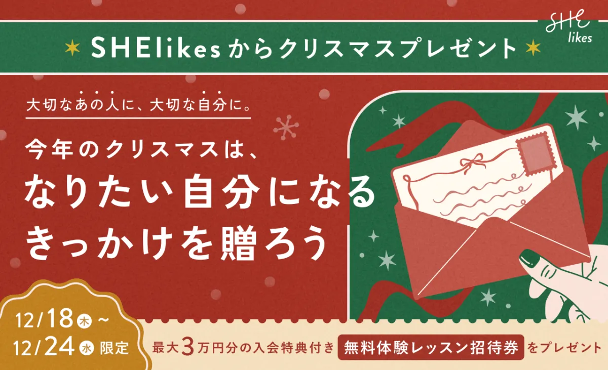 女性向けキャリアスクールのSHElikes(シーライクス)を運営するSHE株式会社は、2025年12月18日から12月24日までの期間に、「学びのギフト」キャンペーンを実施します。このキャンペーンは、定番のクリスマスギフトに加えて、女性が新しいスキルを学ぶ機会を大切な人に贈ろうというもので、オンラインの無料体験レッスンを受けることで、受け取った方が自分のペースで学び始められる機会を提供します。
