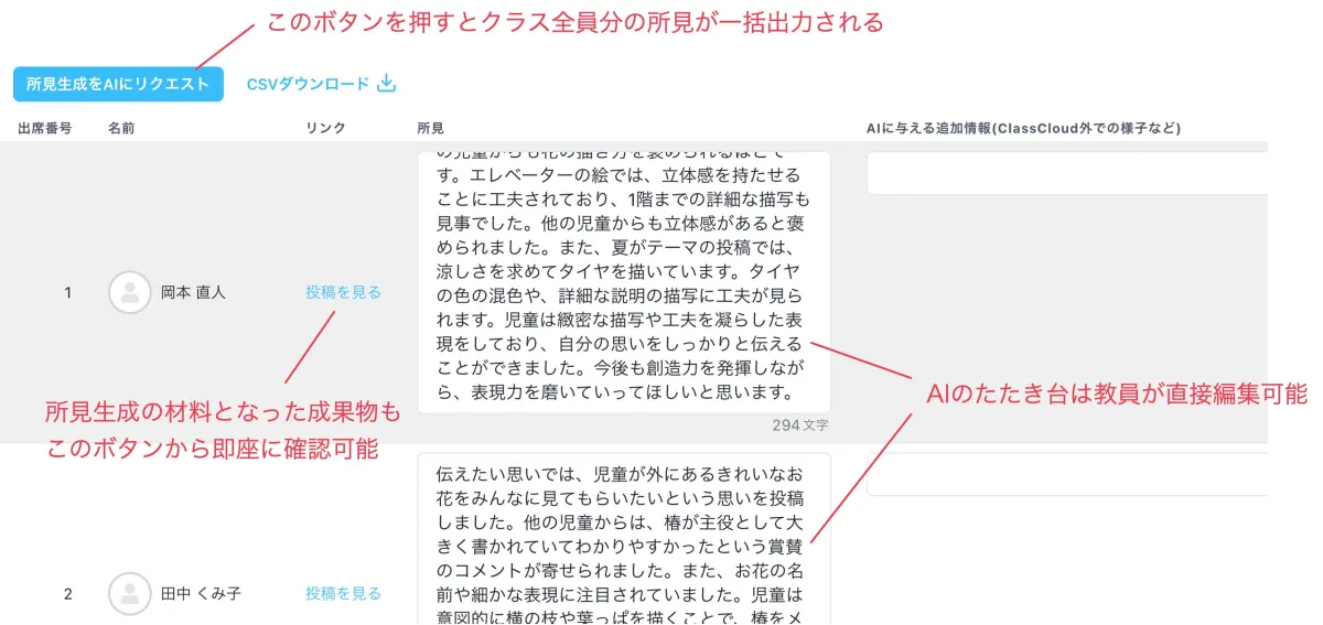 本機能によって、教育の現場における教員の役割はますます重要になってきます。従来の「所見は教員が全て書くべき」という考えに対し、AIとの協働によって教育の質向上に貢献することを目指す姿勢が求められています。教員が子どもの学びをより深く理解するためのツールとして位置づけられるのが、ClassCloudの目指す未来像です。