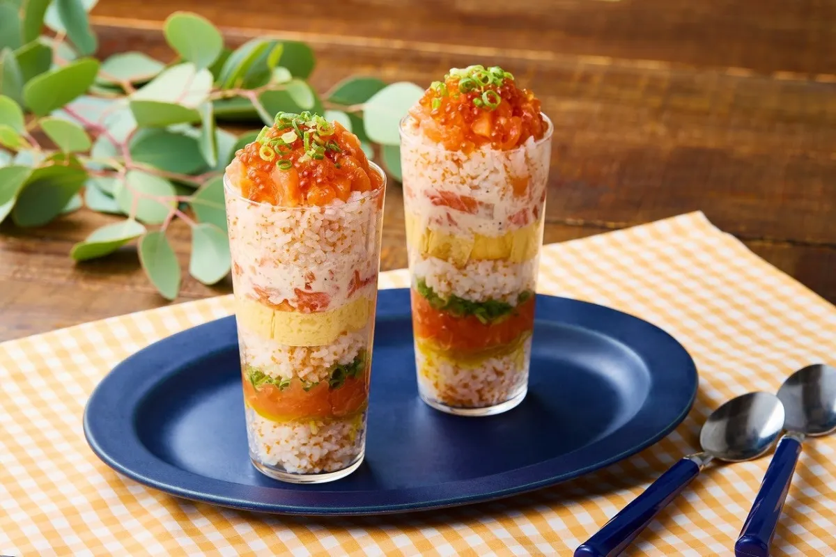 マリンフーズの自慢の一品である「ごろっとサーモン丼」と「サーモンクリームチーズ」を酢飯と層に重ねて仕上げたこの寿司は、カップ盛りなので、手軽に歩きながらも楽しむことができます。美しい見た目は、インスタ映えすること間違いなしです。