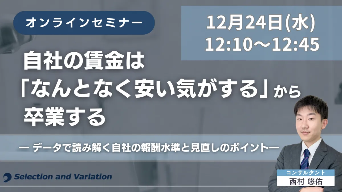 東京都千代田区に拠点を置く組織・人事コンサルティングファーム、セレクションアンドバリエーション株式会社は、2025年12月24日(水)に『自社の賃金は「なんとなく安い気がする」から卒業する』と題したオンラインセミナーを開催します。このセミナーは、物価上昇や人材獲得競争の激化を受けて、賃金に対する企業の悩みが高まっている中で、具体的にどのように自社の報酬水準を見直せるのかを探るものです。