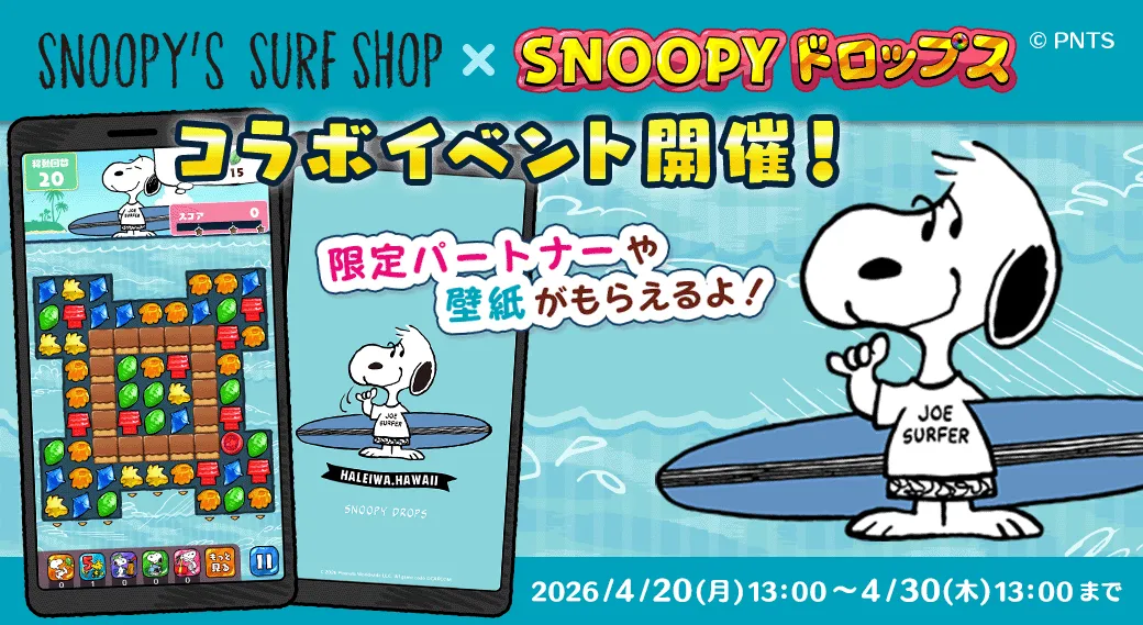 爽快なパズルゲーム『スヌーピードロップス』において、ハワイ初のPEANUTSオフィシャルショップ「SNOOPY’S SURF SHOP」との特別コラボイベントがスタートしました!このコラボは、「SNOOPY’S SURF SHOP」が初めてゲーム内に登場する記念すべきイベントで、サーフィンを楽しむスヌーピーの姿をゲーム内で見ることができます。ゲームの舞台は、サーフィンが盛んなハワイ。爽やかな海の風を感じながら、スヌーピーと一緒に楽しくパズルを解いていきましょう。