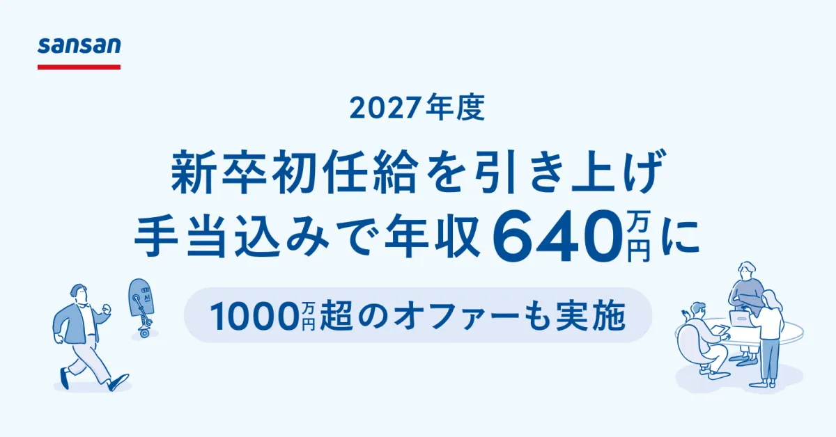 Sansanは、2027年度入社の新卒に対して、初任給を年収586万円(月給41.3万円)に引き上げることを発表しました。この金額には、住宅補助などの手当が含まれるため、初年度からの実質年収は640万円と高水準です。また、特にエンジニアや研究開発職においては、経験やスキルに応じて個別に優遇し、1000万円を超えるオファーが実施されることもあります。