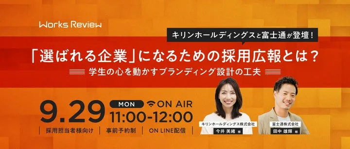 企業が求めるのは、ただ情報を発信することではなく、学生の心に響くブランドづくり。これを実現するためのキーポイントは、共感を生む広報にあります。このオンラインフォーラム「WORKS REVIEW」では、キリンホールディングスと富士通が登壇し、選ばれる企業になるための採用広報の工夫を明かします。