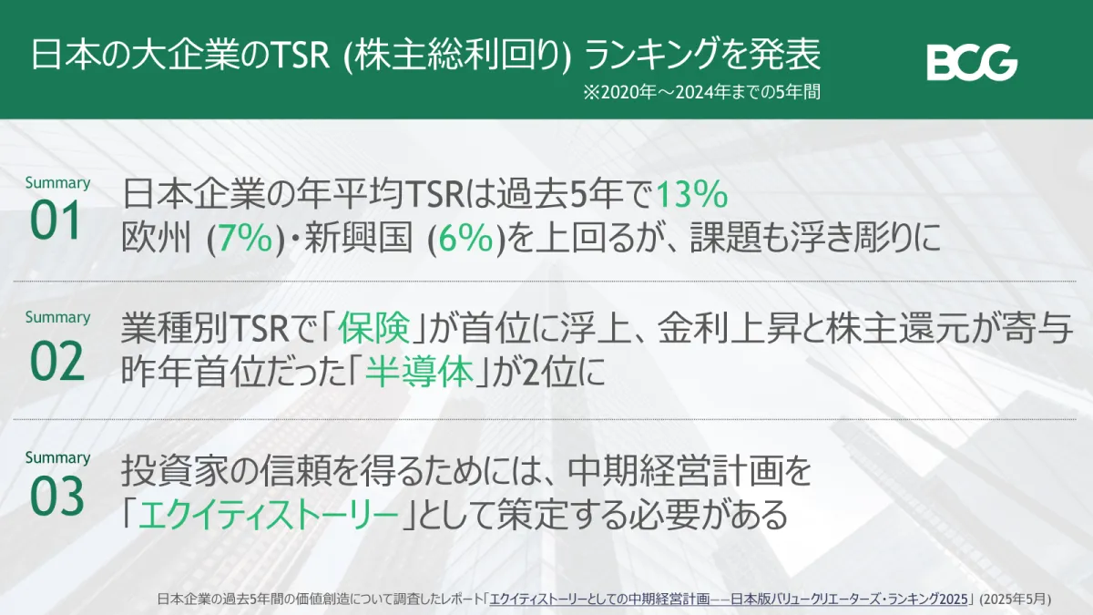 経営コンサルティングファーム・ボストン コンサルティング グループ(BCG)が発表した最新のレポートによれば、2024年までの5年間にわたる日本企業の株主総利回り(TSR)の動向が明らかにされました。年平均TSRは、2020年から2024年にかけて13%と報告され、これは欧州の7%や新興国の6%を上回り、さらには米国の15%に迫る水準に達しています。しかし、この進展の裏には依然として企業が直面するさまざまな課題が存在しています。