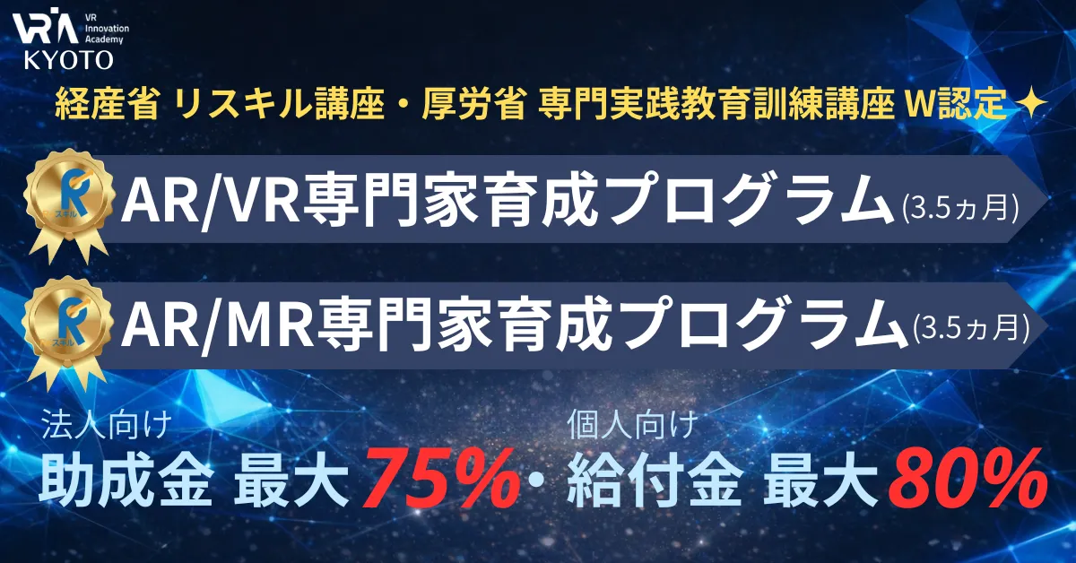 京都市に本拠を置く株式会社クロスリアリティが運営するVRイノベーションアカデミー京都(VRIA京都)が提供する「AR/VR専門家育成プログラム」と「AR/MR専門家育成プログラム」は、経済産業省によるリスキル講座として認定され、さらに厚生労働省によって専門実践教育訓練講座に指定されました。このW認定を受けたことにより、受講生は個人・法人を問わず、多くのサポートを受けることができます。