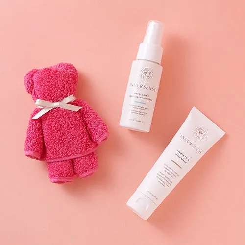 タオルベアはぬいぐるみのように愛らしく、毎日の生活に寄り添う存在です。セットには、スイートスピリットリーブインコンディショナーとハイドレイティングヘアマスクがトラベルサイズで付属し、髪に潤いとしなやかさをもたらします。実際に、このリーブインコンディショナーは、2024年から2026年の間に日本のINNERSENSE商品の中で最も人気を誇る製品です。