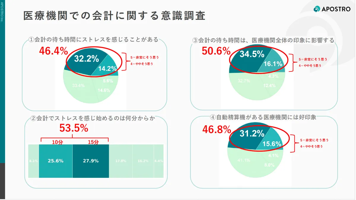 最近の調査によると、医療機関での会計待ちが患者に与える影響が浮き彫りになっています。株式会社APOSTROが実施した調査では、全国約1,000名の患者を対象に、会計の待ち時間や自動精算機の利用状況について分析しました。結果として、なんと46.4%が会計待ちにストレスを感じていることが明らかになりました。