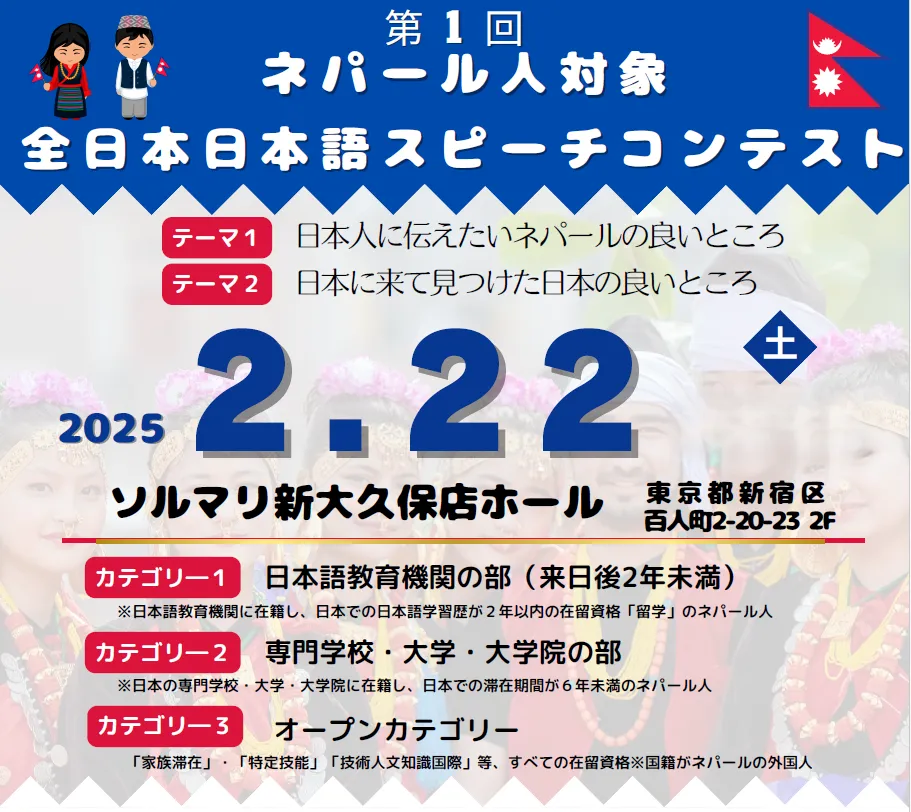 このスピーチコンテストは2025年2月22日に、ソルマリ新大久保店ホール(東京都新宿区百人町)で開催されます。参加資格は日本在住のネパール人で、主催は神田外語学院とSun’s Son株式会社となります。現在、応募受付は終了していますが、参加者たちがどのようなスピーチを披露するのか、とても楽しみです。