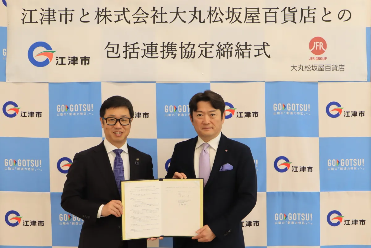 2023年4月23日、島根県江津市にて江津市長の中村中様と大丸松坂屋百貨店の代表取締役社長、宗森耕二が包括連携協定を締結しました。この協定は、江津市と大丸松坂屋の協力により地域資源の活用とデジタル技術を取り入れたシティプロモーションを推進し、地域の活性化及び持続可能なまちづくりを目指すものです。