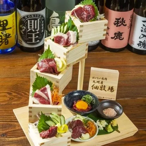 - - 佃牧場直送の純国産馬刺し階段盛り (もも/上ロース/こうね/フタエゴ/バラ/ヒレ/ユッケ)