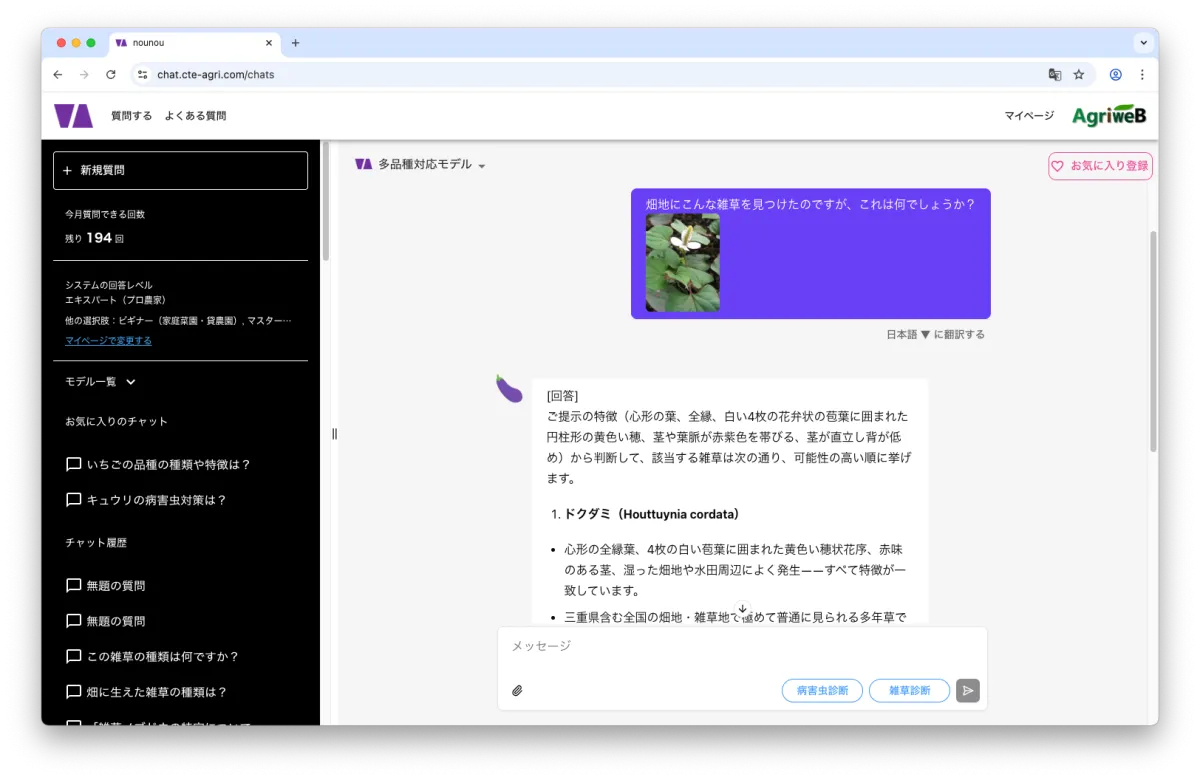 さらに、AIは正確な診断を行うための情報を提供し、ユーザーが追加で必要な特徴を入力したり、他の画像をアップロードすることも可能です。これにより、診断精度が向上し、迅速かつ効率的に雑草問題に対処できるのです。