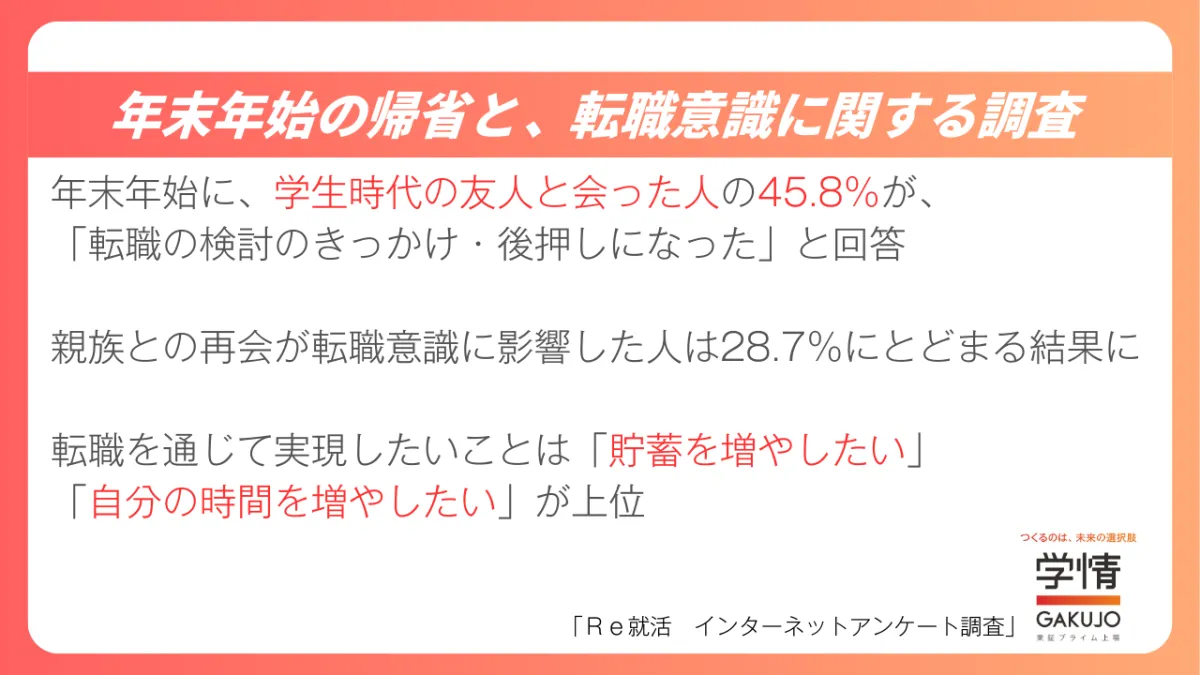 年末年始は、地元への帰省や友人、親族との再会を通じて、新たな気づきを得る時期でもあります。特に20代にとって、この時期の人とのつながりはとても重要です。株式会社学情が実施したアンケート調査によれば、学生時代の友人と再会したことで、転職を考え始めた人が多いことがわかりました。