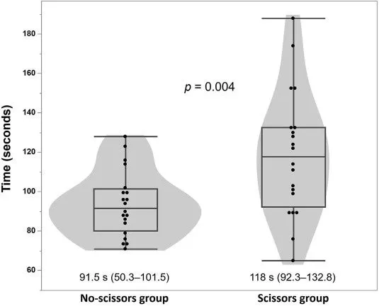 具体的には、ハサミを使用した場合、中央値で118秒かかる一方で、ハサミを使わなかったグループでは91.5秒と、約24秒の差が生じたことが確認されました。これは、一般市民がAEDを使用する際に衣服処理の方法が、救命活動のスピードに直接的に影響を及ぼすことを示しています。
