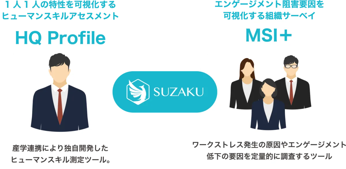 SUSは、「人と企業の笑顔が見たい」という理念のもとで、2003年にヒューマンスキルを可視化するツール「HQ Profile」を独自に開発しました。そして、採用マッチングソリューションから進化した「SUZAKU」をリリースし、これまでに組織心理学を融合させたデータ解析を行ってきました。すでに、実績を持つアセスメントツールや、エンゲージメントデータの活用において、SUSは注目されてきた企業です。