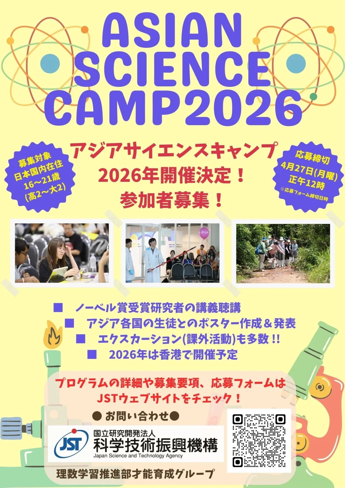 理事長橋本和仁が率いるJSTは、2026年8月2日から8月8日に香港で開催される第16回アジアサイエンスキャンプ(ASC2026)の参加者を募集します。このプログラムは、物理、化学、生物学、数学などの科学に興味のある高校2年生から大学2年生までの生徒が対象です。