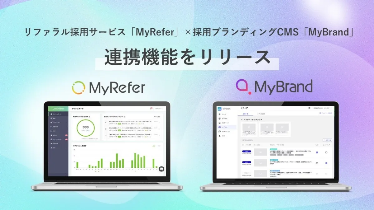 株式会社TalentXは、2025年3月24日にリファラル採用サービス「MyRefer」と採用ブランディングCMS「MyBrand」の連携機能を正式にリリースしました。この新機能により、MyBrandで作成された採用オウンドメディアの記事が自動的にMyReferの社内リクルーターに連携されるため、リファラルを通じた応募数の増加と同時に、社員のエンゲージメントも強化されます。