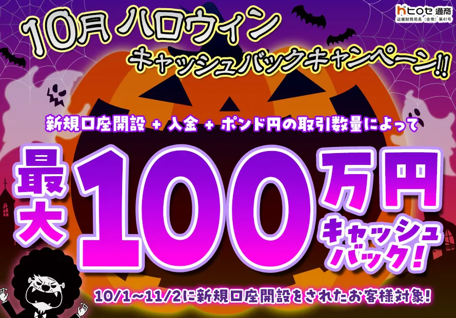 ヒロセ通商株式会社が、2025年10月1日から「10月ハロウィン最大100万円キャッシュバックキャンペーン」を開始しました。これは新規口座開設者を対象にしたもので、ポンド円の取引量に応じてキャッシュバックが行われるという内容です。最高で100万円を受け取るチャンスがあります。
