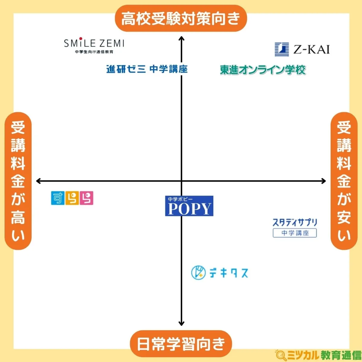 公開されたポジショニングマップは、特に「受講料金が高い・安い」という切り口と、「高校受験対策向き・日常学習向き」といった目的別に、通信教育を整理しています。このマップは、家庭がコスト対効果を考慮した選択を行えるように配慮されており、利用者がどの教育サービスが最適かをスムーズに判断できる手助けとなります。