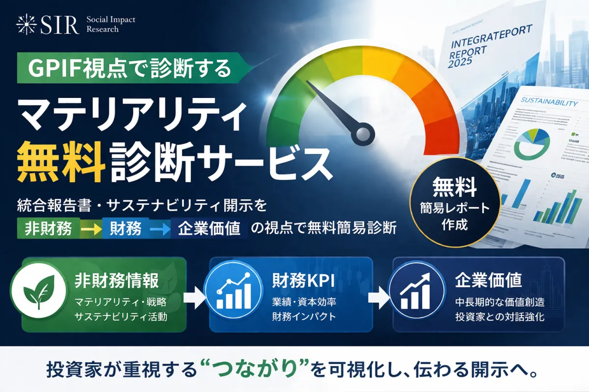 株式会社ソーシャルインパクト・リサーチ(SIR)は、年金積立金管理運用独立行政法人(GPIF)が発表した最新のサステナビリティ開示に関する評価を基に、上場企業を対象とした「マテリアリティ無料診断サービス」を新たにスタートさせました。このサービスは、企業がサステナビリティ施策を効果的に実施しているかを評価し、投資家との対話を強化するための具体的なアドバイスを提供します。