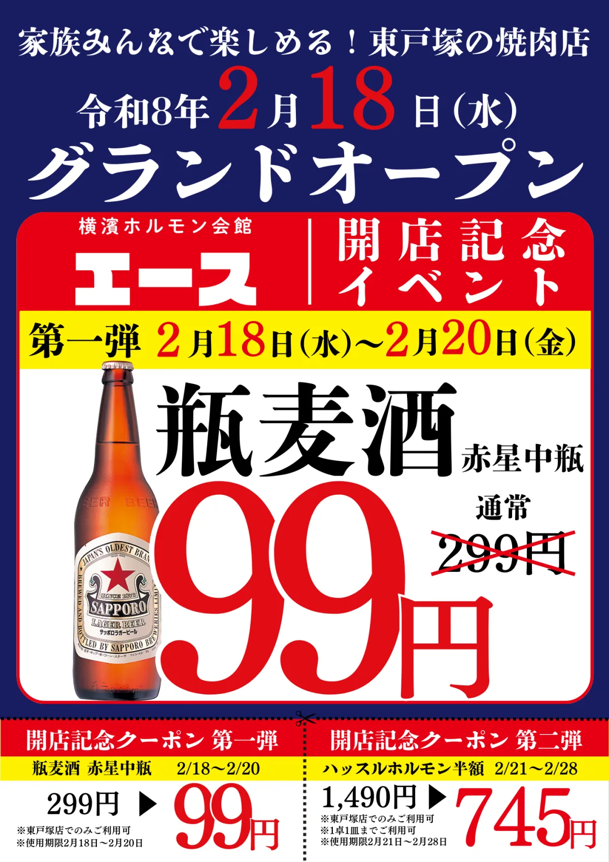 さらに、オープン記念として、2つの特別イベントを用意。1つ目は、2026年2月18日から20日の間限定で、赤星の瓶ビールを通常の299円から99円で提供します。飲食文化を気軽に体験してもらいたいという思いから企画されたこのイベントは見逃せません。