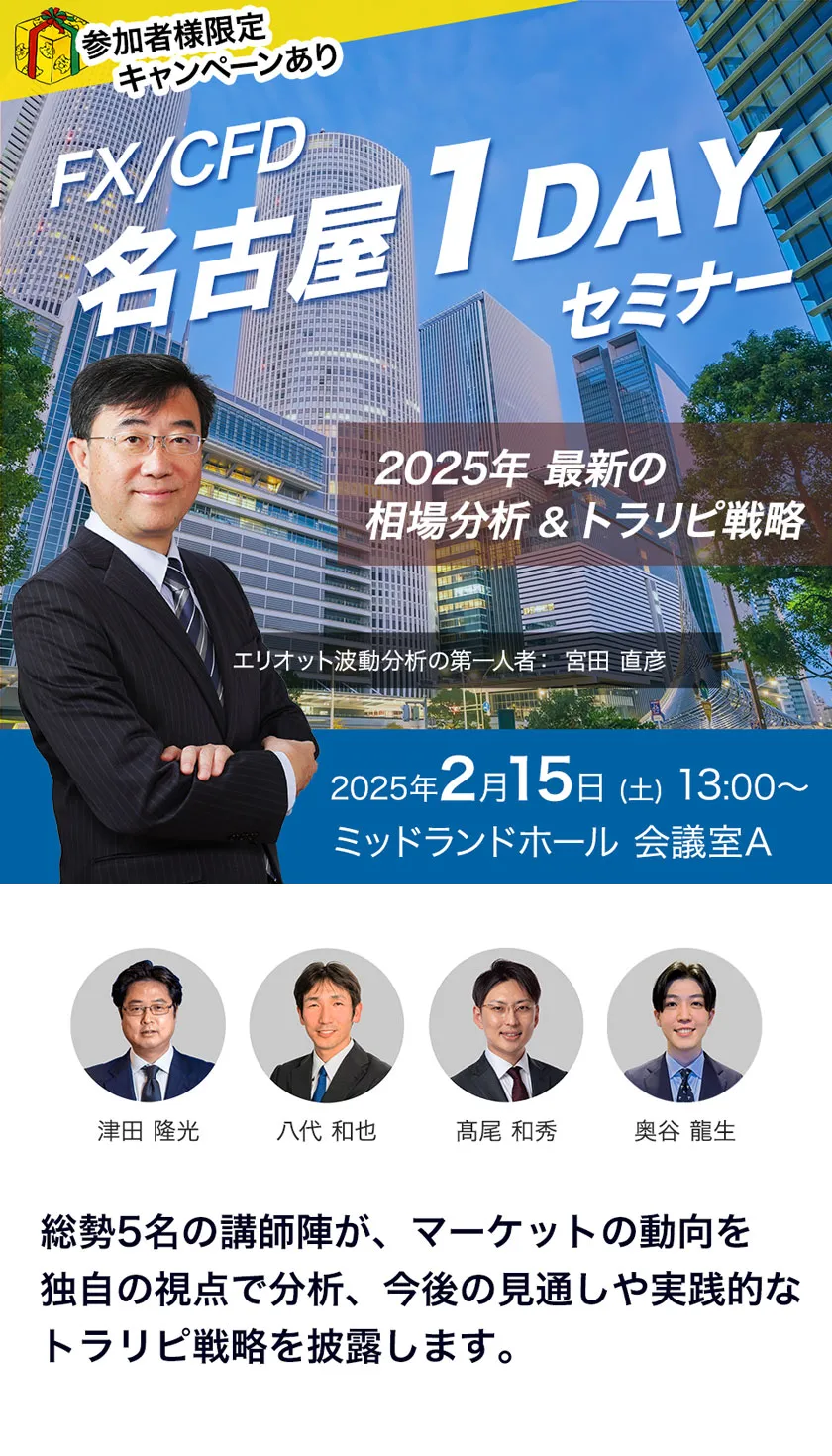 株式会社マネースクエアは、2025年2月15日(土)午後1時より名古屋にて「FX/CFD 名古屋 1DAYセミナー」を開催します。このセミナーでは最新の相場分析や実践的なトラリピ戦略の紹介を行います。参加者は独自の視点を持つ当社の5名のアナリストから、マーケットの流れや今後の見通しについて直接アドバイスを受けることができます。