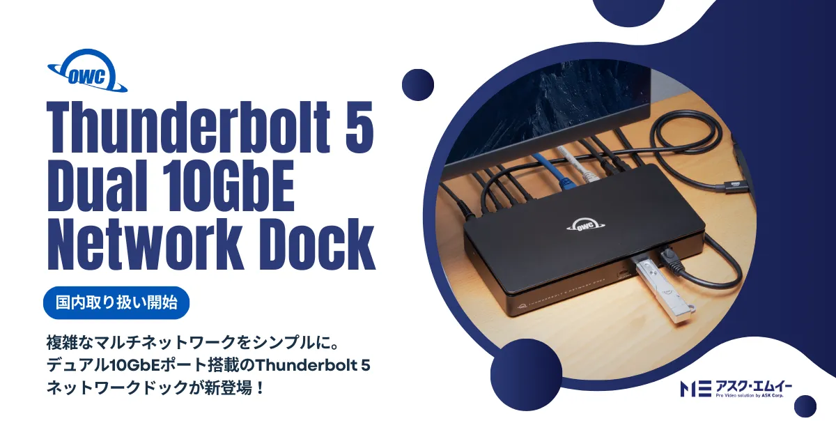 株式会社アスクは日本正規代理店として、OWC社の新製品「Thunderbolt 5 Dual 10GbE Network Dock」の取り扱いを開始しました。このネットワークドックは、デュアル10GbEポートを搭載し、1本のThunderbolt 5ケーブルで複数の高速ネットワーク接続やNASへの超高速アクセスを実現します。映像制作やメディア運用、ITインフラの分野で求められる高い性能と柔軟性を備えており、プロの制作現場でのニーズに応えます。