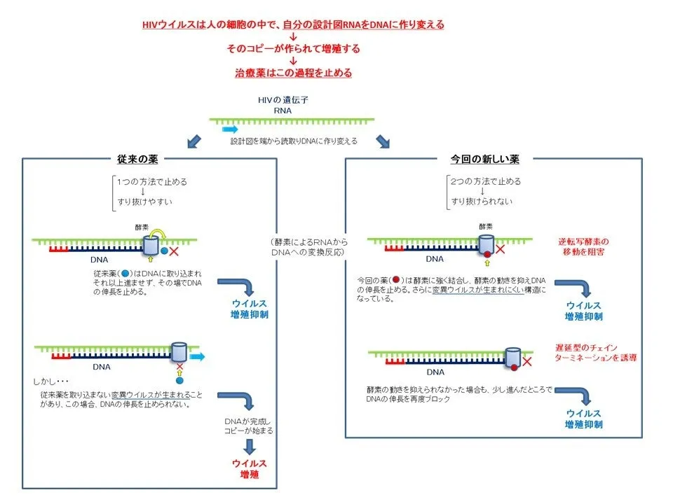 「イドビンソ」の最大の特徴は、その独自のメカニズムです。新薬は二段階でHIVの増殖を止めることを可能にします。まず第一に、DNAの伸長に関与する酵素の移動を阻害し、HIVの複製を抑えます。さらに、これが効果を示さなかった場合にも、もう一つのメカニズムで伸長を停止させることで、ウイルスが再び増殖するのを防ぎます。こうした二段階のアプローチにより、ウイルスの耐性疲労が生じにくい特性も備えられています。
