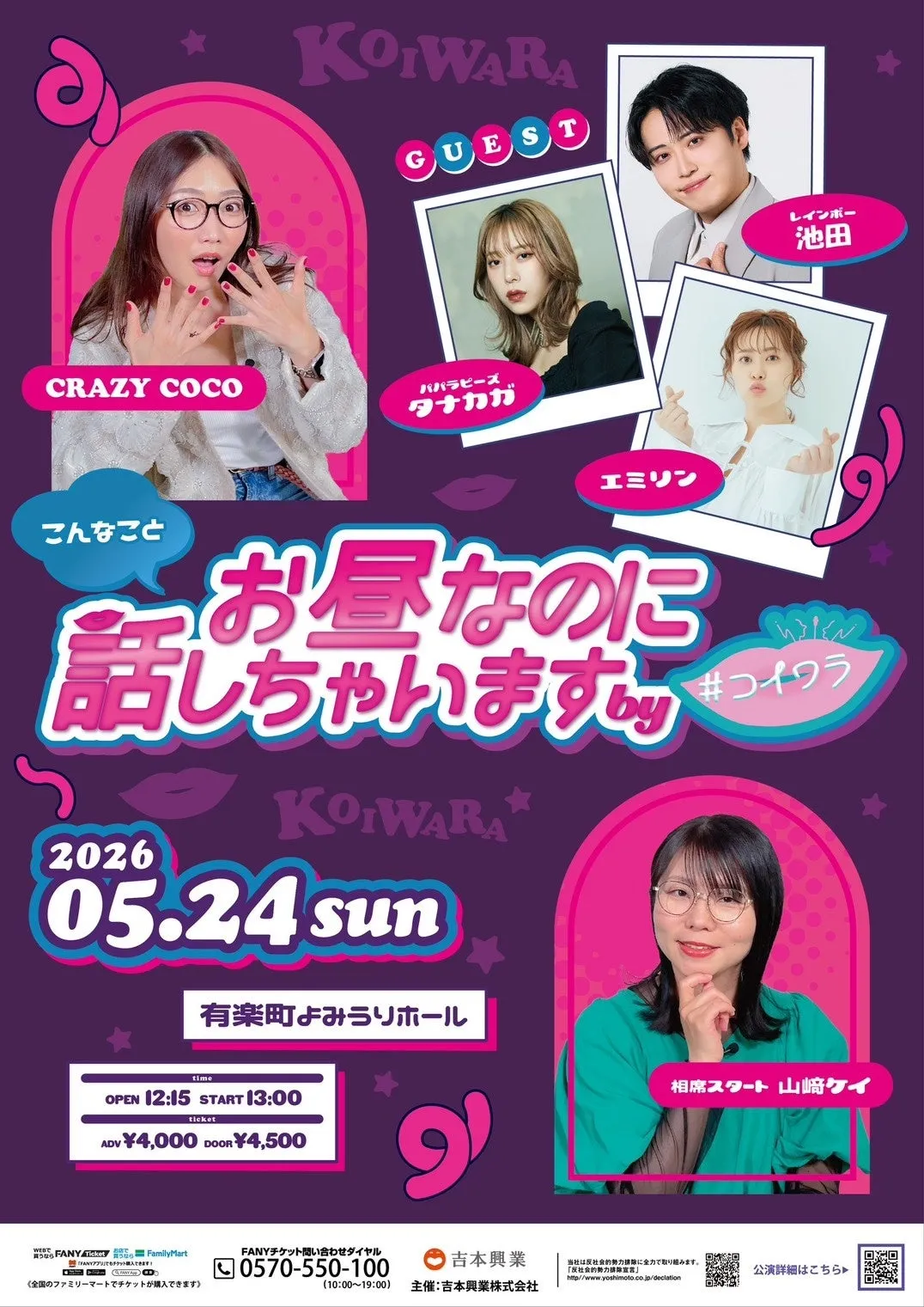 5月24日(日)、有楽町よみうりホールで開催される恋愛トークライブ『お昼なのにこんなこと話しちゃいます by #コイワラ』に、レインボー・池田直人が急遽参加することが発表されました。このイベントは、芸人たちの恋愛観を披露するYouTubeチャンネル「#コイワラ」が主催しており、普段話せない恋愛や性の悩みについて、ゆるやかな雰囲気で語り合います。