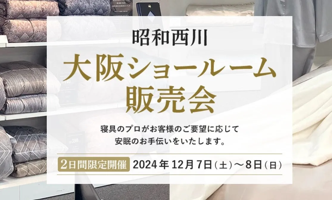 来る12月7日(土)・8日(日)の2日間、大阪で昭和西川によるショールーム販売会が開催されます。この販売会では、オンラインでも人気のアイテムをはじめ、昭和西川の定番商品である「ムアツマットレス」など、すべての寝具を実際に試すことができます。通常の購入では味わえない体験を通じて、商品の良さを実感していただける貴重な機会です。