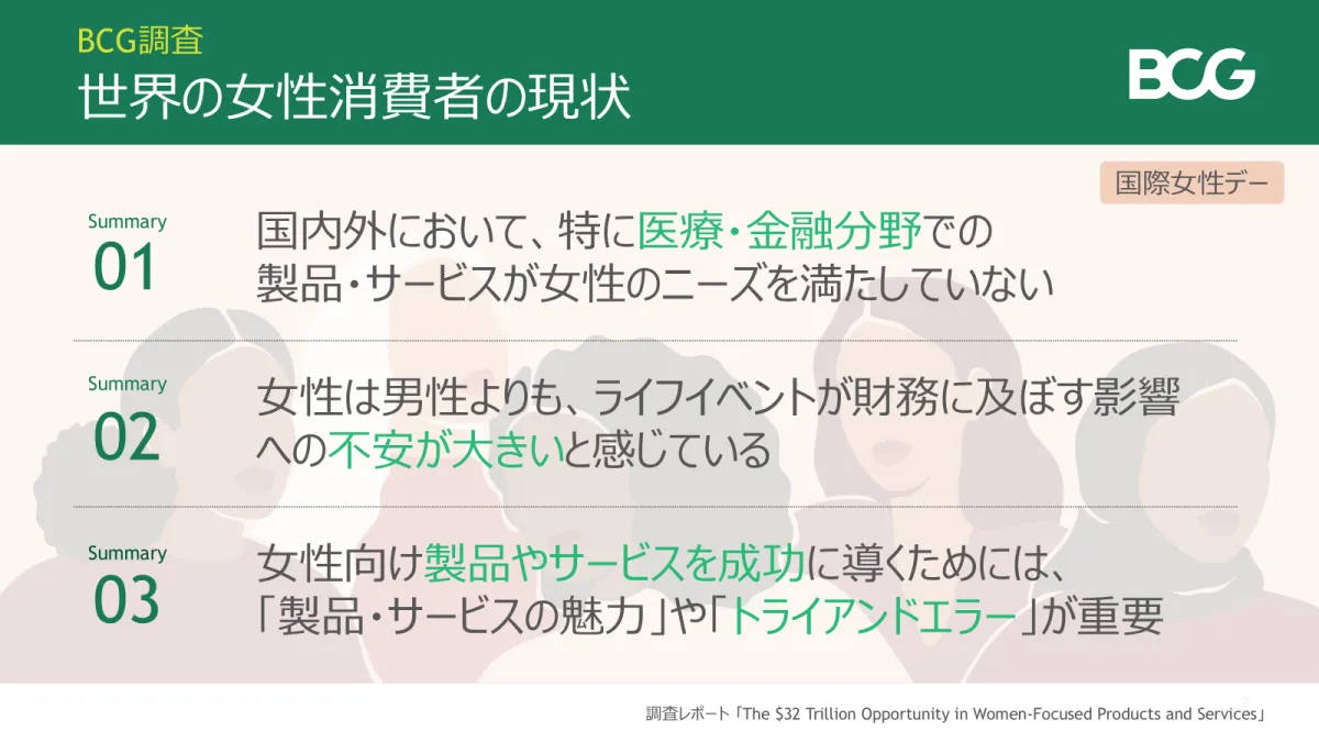 BCGの調査結果によれば、女性は世界の消費支出の約32兆ドルを管理しており、今後5年以内には全体の75%に達すると予想されています。しかし、調査では消費財、医療、金融といった主な分野で女性が自分たちのニーズを満たしていないと感じている割合は高いことが分かりました。特に医療において、家庭内のヘルスケアの意思決定を70%以上の日本の女性が担っているにもかかわらず、女性特有の健康問題に対するサービスが十分であると感じている女性はわずか41%に留まっているのです。
