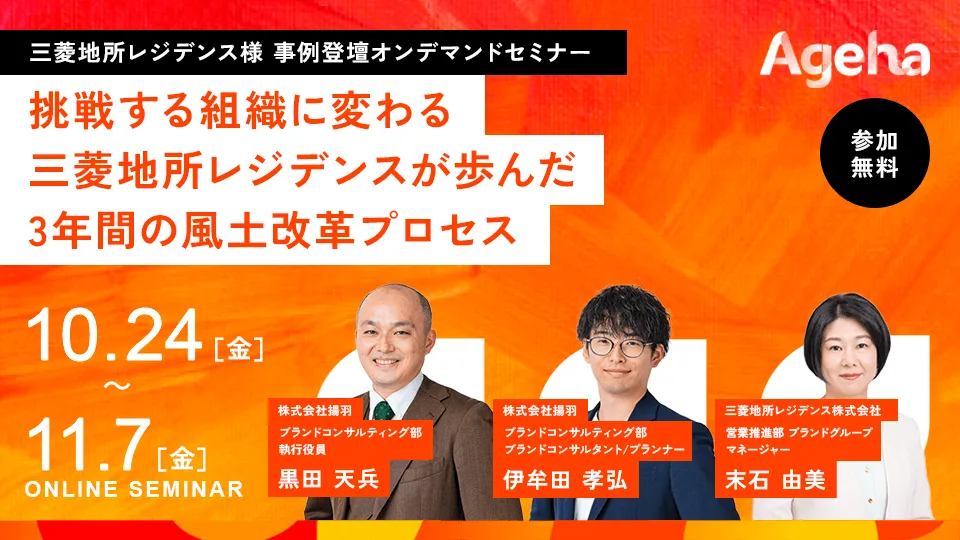 2025年秋、株式会社揚羽が主催するオンデマンドセミナー「挑戦する組織に変わる -三菱地所レジデンスが歩んだ 3年間の風土改革プロセス-」が開催されます。セミナーでは、三菱地所レジデンスが取り組んできた風土改革の取り組みとその成果について深く掘り下げ、参加者に学びの場を提供します。