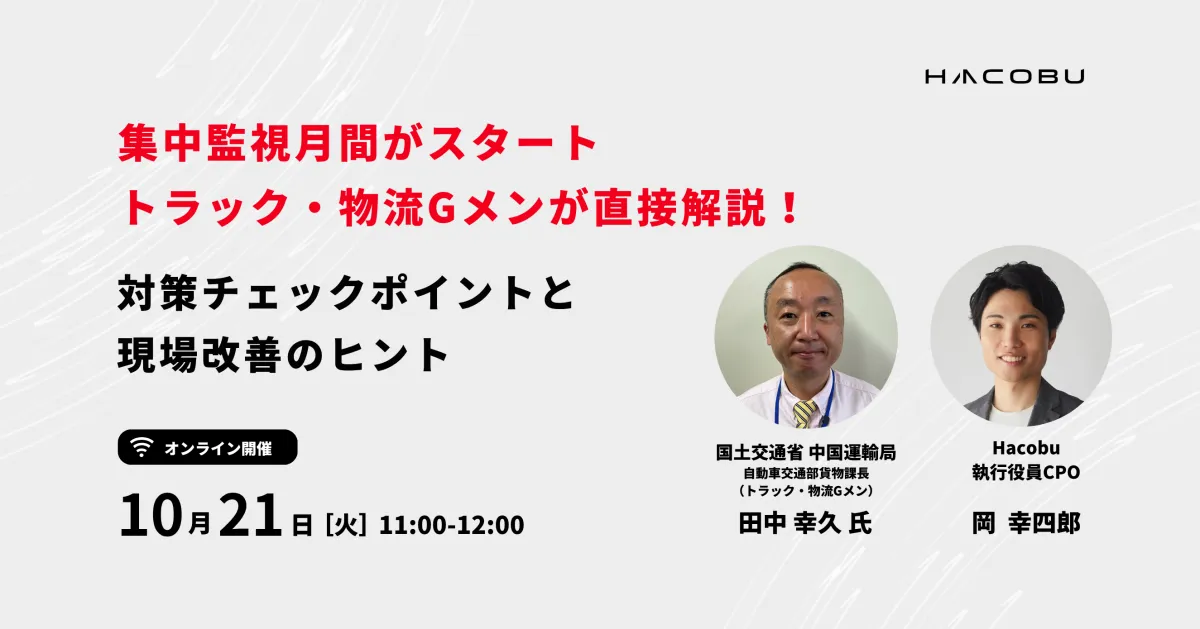 このセミナーでは、国土交通省中国運輸局の田中幸久氏をゲストに迎え、Gメンならではの具体的なチェックポイントについて詳しく解説します。これに加えて、Hacobuからは、法令遵守と業務の効率化を同時に実現するためのソリューションを紹介する予定です。