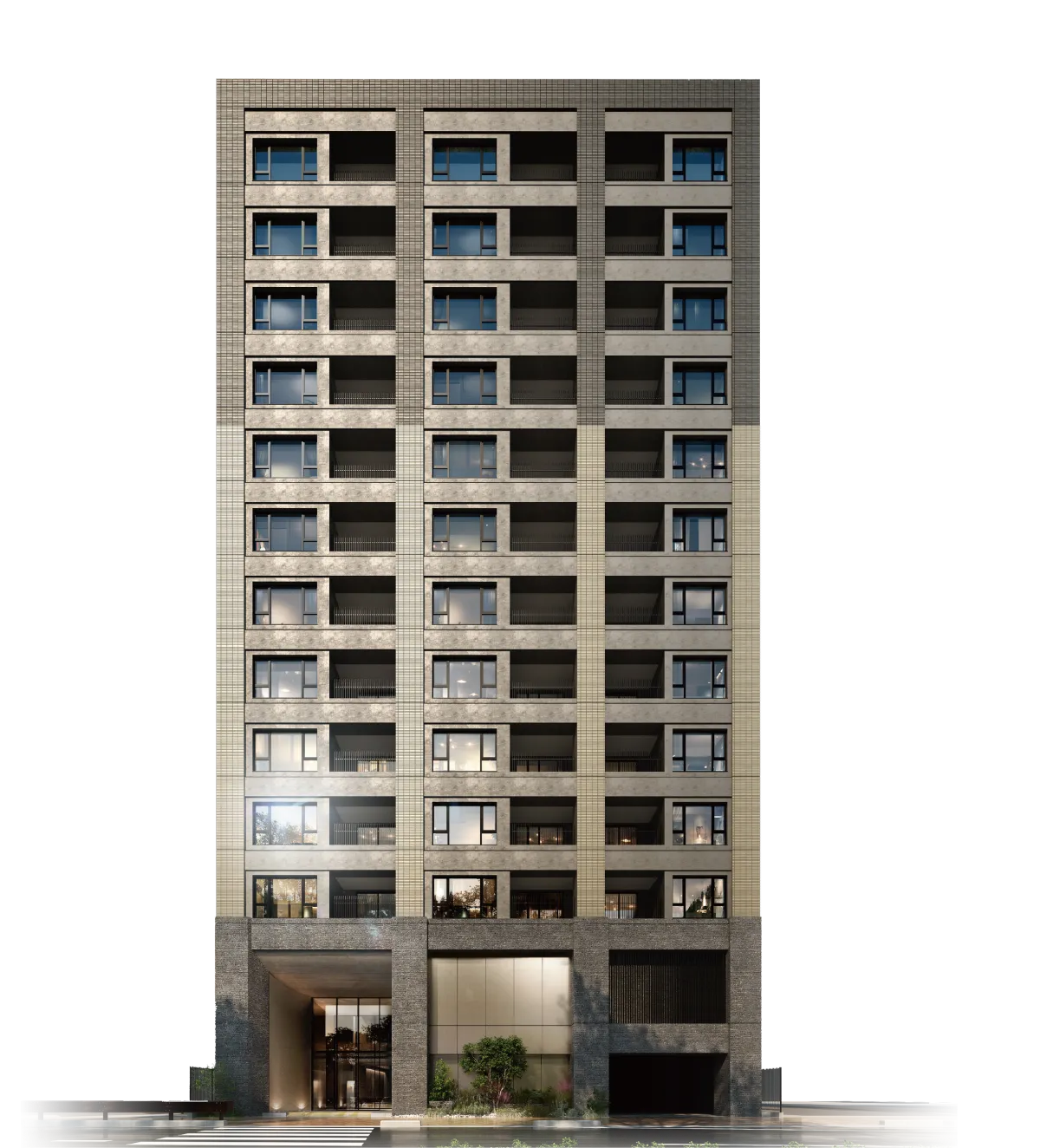 『レ・ジェイド目黒』の設計コンセプトは「Refined Heritage(洗練された継承)」で、目黒の歴史と文化に調和した外観デザインが特徴です。周辺の神社仏閣との調和を意識した外観は、静謐で落ち着いた雰囲気を醸し出しています。物件の正面には時の流れを感じさせる素材を採用し、まるで元々この場所に存在していたかのような普遍性を持たせています。