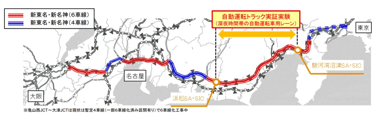日本政府は「デジタルライフライン全国総合整備計画」に基づき、自動運転トラックの実証実験を展開しています。新東名高速道路の一部区間(駿河湾沼津SA~浜松SA、約100km)を利用し、V2N通信を通じて車両と通信ネットワークの連携を強化することで、自動運転の円滑な運行を目指します。この実験によって、V2N通信技術の有効性や信頼性を検証し、将来的な社会実装を見据えたデータを集めることを目的としています。