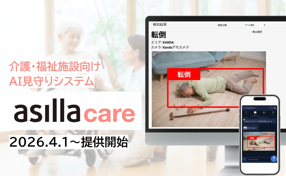 「asilla care」は、これまでアジラが手掛けてきたAI警備システム「AI Security asilla」の技術を基盤にしており、商業施設やオフィス環境での安全管理の専門知識を介護へと応用しています。転倒や徘徊といった介護現場特有のリスクに対応するために設計されました。