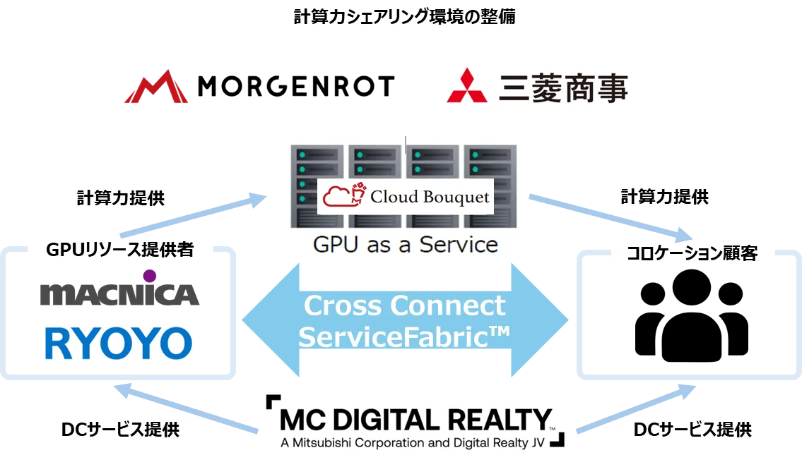 この新サービスは、MCデジタル・リアルティのNRTキャンパス(千葉県印西市)およびKIXキャンパス(大阪府茨木市・箕面市)で展開され、企業が必要な GPU 計算力にアクセスできる環境を提供します。モルゲンロットの「Cloud Bouquet™」の技術を用いて、MCデジタル・リアルティのデータセンター内に設置されるマクニカと菱洋エレクトロのGPUサーバーから計算力を提供。これにより、企業は先行投資なしに柔軟にGPU計算力を利用できます。