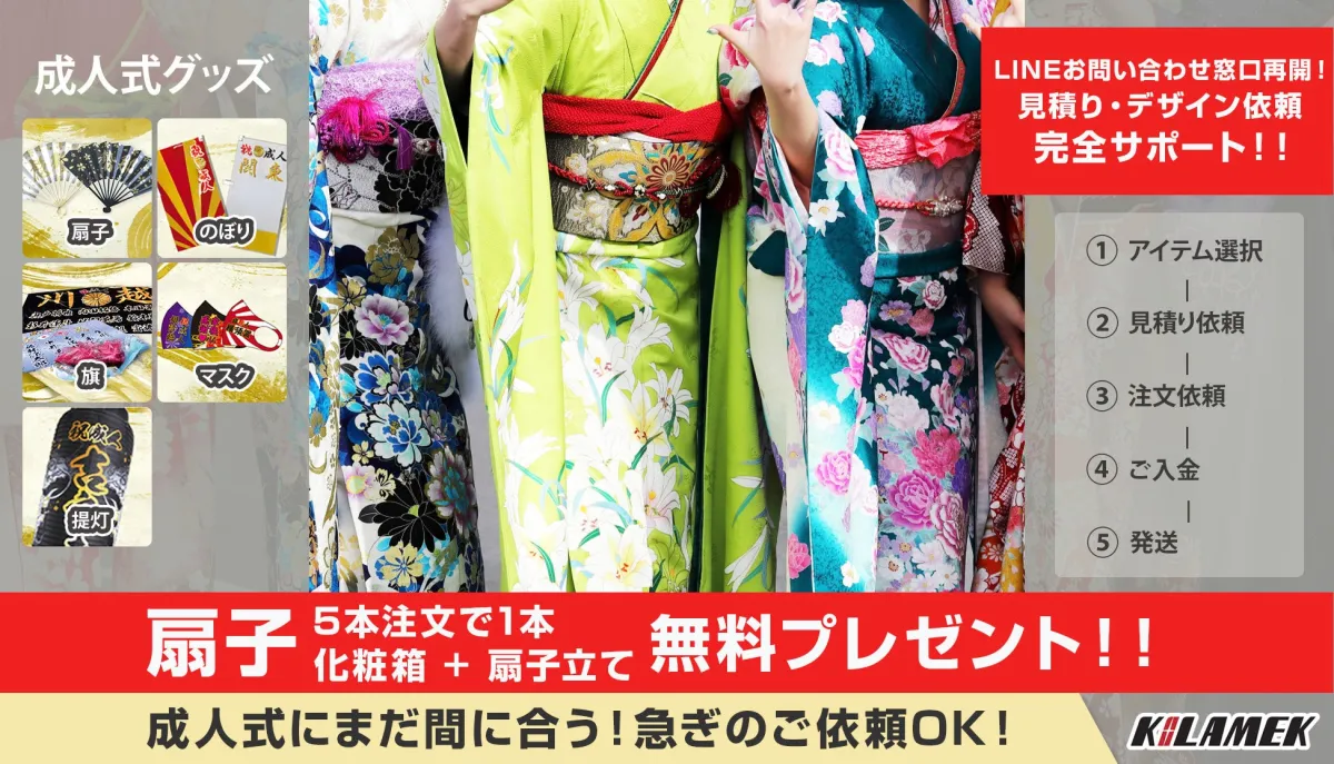 株式会社KILAMEKが、成人式の時期に向けた取り組みとして、約2年ぶりに成人式グッズのLINEお問い合わせ窓口を再開しました。この窓口は、成人式を迎える新成人や、仲間同士で“おそろいデザイン”を作りたい方たちのために設けられています。