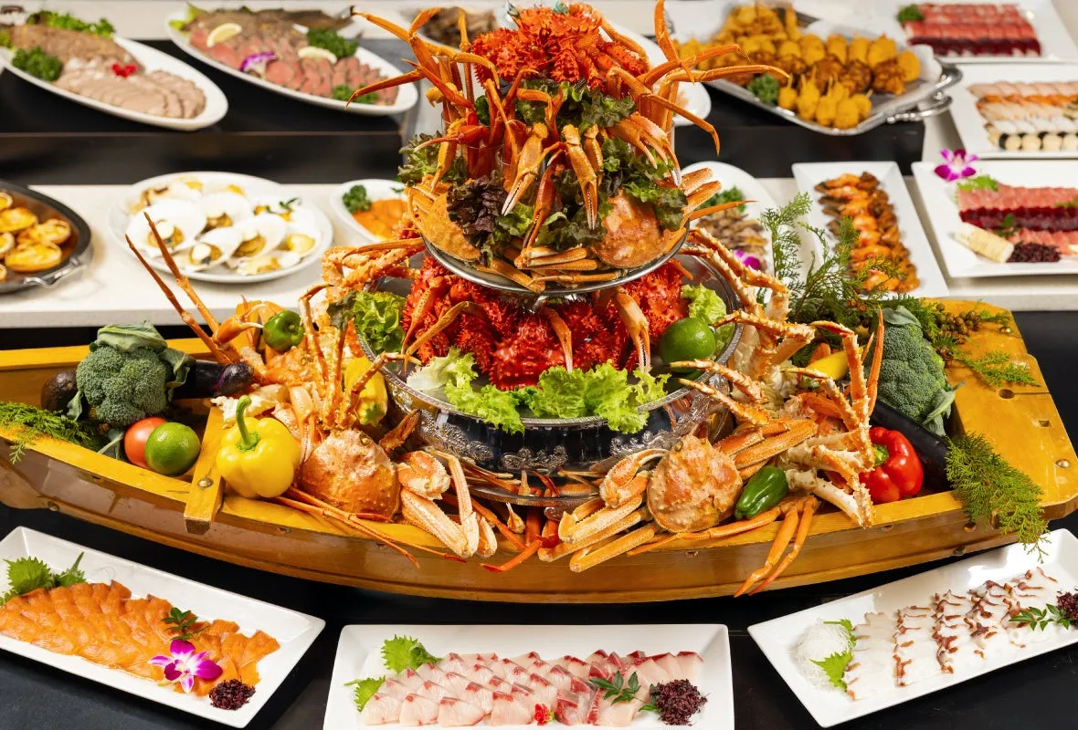 タラバガニが一人あたり1本だけ楽しめるライブキッチンでは、他にはない贅沢を感じられます。海の幸は、お寿司や刺身、海鮮丼など多彩な形で提供され、色々な具材の組み合わせが楽しめるのもこのバイキングの魅力です。