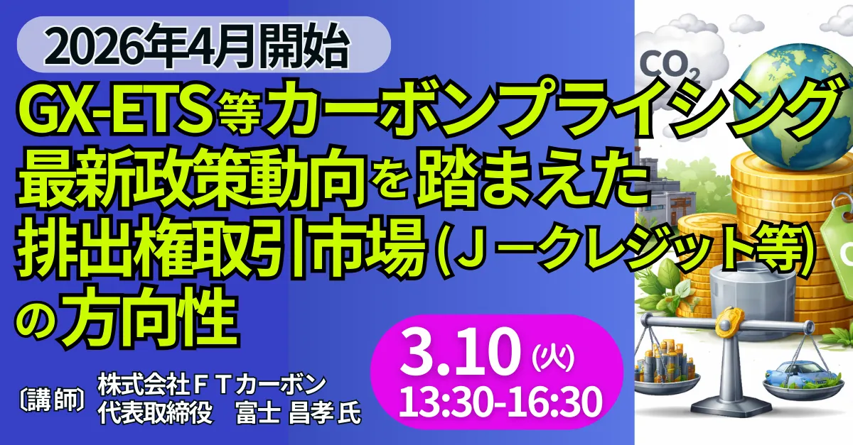 2026年4月に導入予定のGX-ETS(排出量取引制度)に関するセミナーが、2026年3月10日(火)に行われることが決まりました。このセミナーでは、株式会社FTカーボンの代表取締役、富士昌孝氏が講師を務め、最新のカーボンプライシング政策動向を踏まえた排出権取引市場、特にJ-クレジットの今後の展望について詳しく解説します。