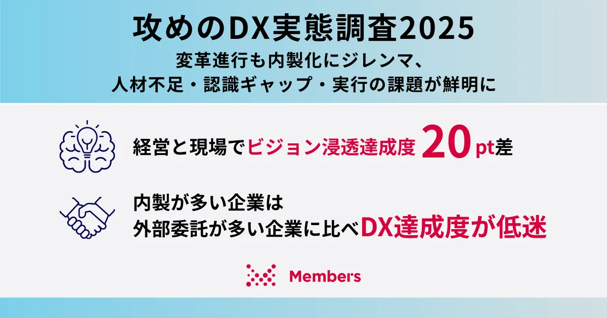 最近、株式会社メンバーズが発表した「攻めのDX実態調査2025」は、デジタルトランスフォーメーション(DX)の進展状況や課題を浮き彫りにしました。調査対象は、攻めのDXに関与する大手企業の経営者や管理職301名です。この調査は、特に企業内でのビジネスモデルの変革や新規事業開発に焦点を当てています。